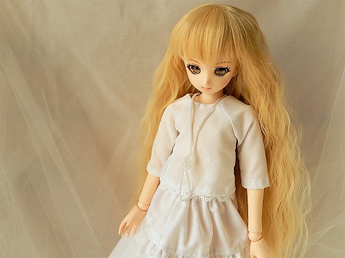 パールネックレスは伸びるテグスで。ちょっと長くしすぎたかなーと反省。