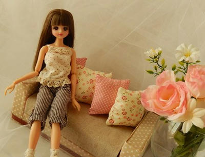クッションはピンク系と青と茶。雰囲気に合わせて変えられるように。