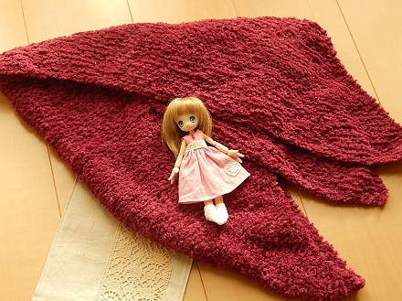 三角の一番長い一辺が124cmです。ちょっとホコリっぽい毛糸だったので、