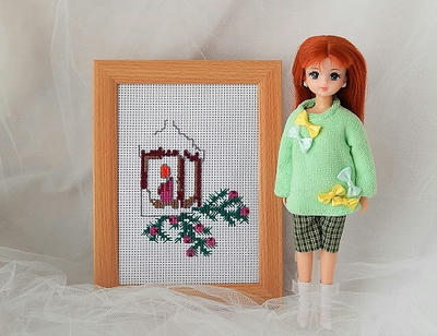 葉っぱと花はハーフステッチ、ランプの輪郭はバックステッチに