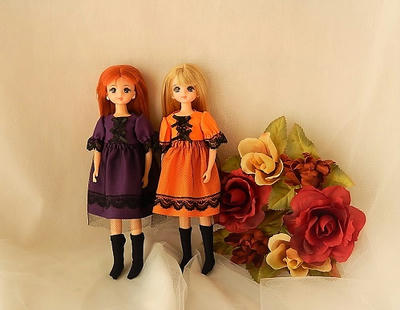布を紫とオレンジにしたので、黒一色のレースやリボンでも大丈夫に