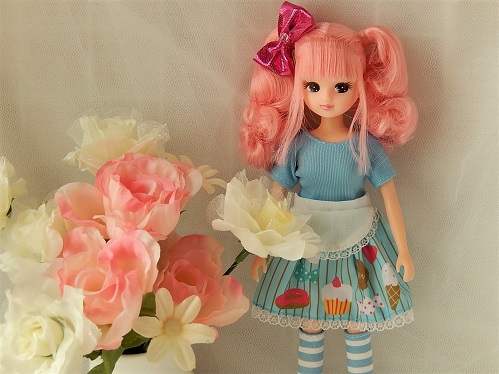 着せているのはダイソーエリーちゃんの新作、「スイーツショップ店員さん」。