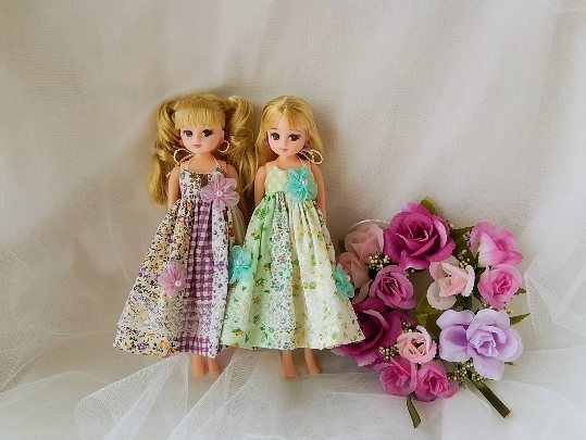 パッチワークのキャミワンピ、もちろんリカちゃん達にもつくってます。