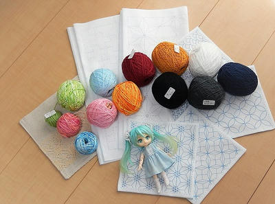 刺し子糸を玉に巻くのと、刺し子布を仕立てるの。
