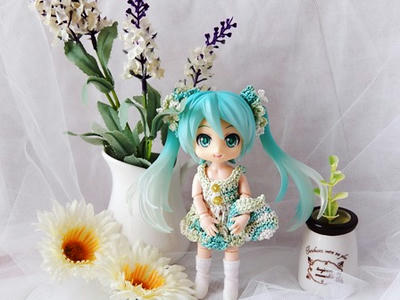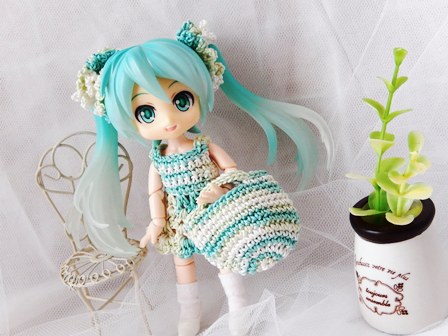 ミクさんのイメージに合わせてレース編みのワンピを編みました。