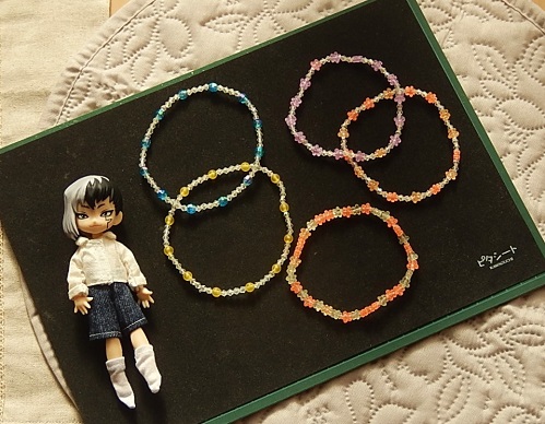お花っぽいビーズと合わせたブレスレットをつくりました。あちらも